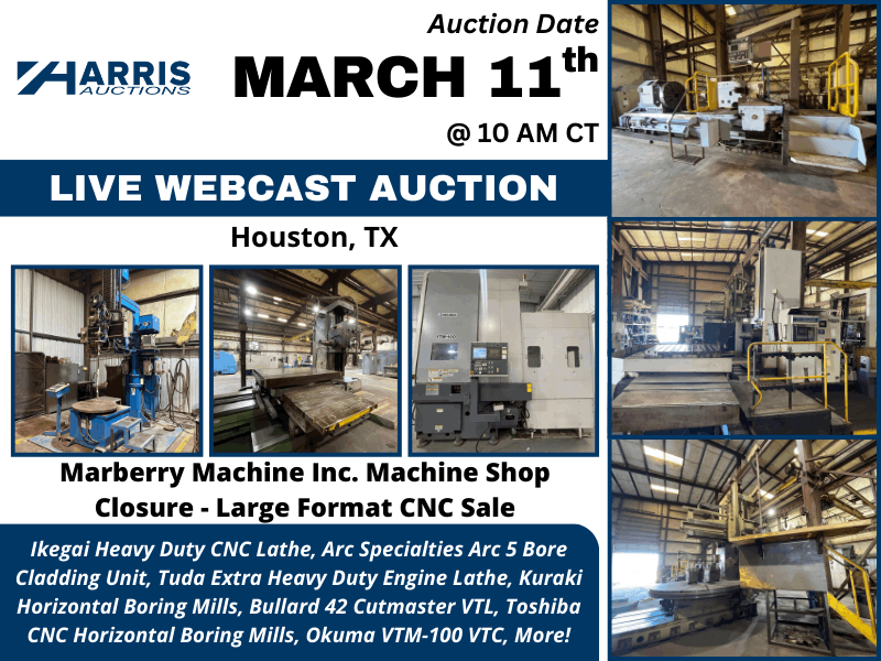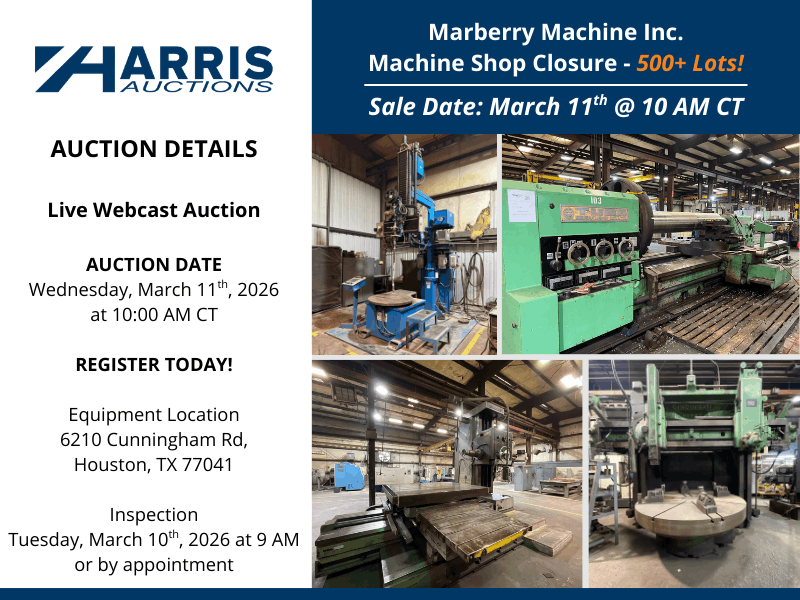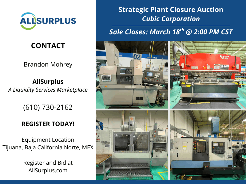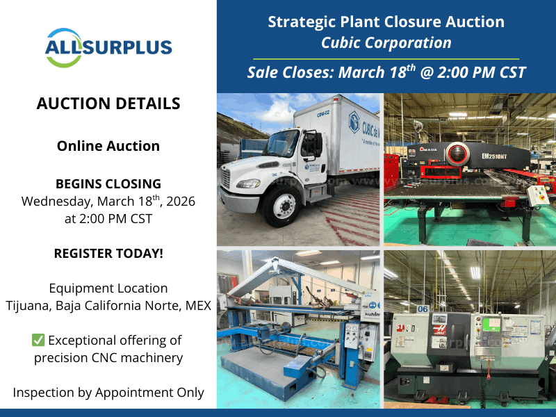 Search Our Listings183,659 Machinery & Electrical Equipment Listings as of 03/04/2026 Start Your SearchElectric Motor SearchSearch by HP/RPM/Volts/Frame or start below with a frame: Frame: Motor SearchTransformer SearchSearch by KVA/Volts or start below with the KVA: KVA: Transformer SearchWanted or For SaleLet our network of dealers find the machine you need or turn your idle assets into cash.Send free e-blast to dealers now! Featured Auctions & Liquidations & Machinery Deals! Sign up for Auction Alerts 3 ENDS 3/4Timed OnlineSurplus to Continuing Operations of Johnson Controls Federalsburg, MDENDING NOW2-Day Auction: 1,000+ Lots of Fabricating & Welding EquipmentFeaturing: NEW, NEVER USED 2023 DAVI MCB 130 4-Roll Plate Rolls; MARINE TRAVELIFT 35 BFW 35 Ton Straddle Carrier; MARVEL & HYD-MECH Band Saws – New as 2023; 2016 KOIKE-ARONSON Plasma Shape Cutter; PANDJIRIS 1400 Subarc Weld Manipulator; (50+) LINCOLN & MILLER MIG, TIG, and Sub-Arc Welders; Tank Turning Rolls, Free-Standing Bridge Cranes – up to 25 Ton Cap; Broad Selection of Surplus OEM and MRO Inventory; Much More!View Auction 3 ENDS 3/4Live WebcastSmurfit Westrock Facility Closure MRO & Spare Parts Forney, TXENDING NOW2- Day AuctionFeaturing 1,000+ lots of MRO and spare parts, including 100+ new and rebuilt motors up to 950 HP, wire spools, ABB and Allen-Bradley drives, pad mount transformers, 4,000+ SKF, FAG, Timken, and NSK bearings, gearboxes, pumps, valves, electrical components, stainless pipe, hoists, wire, and copper, stainless, and aluminum scrap.View Auction 3 ENDS 3/10Online AuctionAmFor Electronics – Custom Cable and Wire Harness Manufacturer Portland, ORFeaturing: 2008 MAKFIL SYSTEM SP200-09 Automatic Cutting Machine, AMP 1214316-1-B Automatic Wire Measure, CARPENTER Compu-Strip 97 Automatic Wire Measure, 2022 KOMAX Mira 340Q Rotary Wire Stripper, 2011 MECAL TT Wire Crimping Presses, CIRRIS Easy Touch Pro HIGH Voltage Cable Tester, 2024 CHICAGO PNEUMATIC Vertical Air Compressor, CROWN 2,750 LB Cap. Electric Forklift, STATEGIC ACCU-SORT II Heat Shrink Tunnels, Crimping Presses, Wire Harness Assembly Stations, Much More!View Auction 3 ENDS 3/10Online AuctionExcavators, Service Trucks, Trailers & Heavy Equipment Hortense, GAFeaturing: 2018 CATERPILLAR Mini-Excavator Mo 301.8, 2016 CATERPILLAR Mini-Excavator Mo 304E2, 2016 FORD F350 Super Duty Platinum Pickup Truck, 2017 BOBCAT T590 Skid Steer Mo T590, 2014 FORD E350 Van with READING Utility Body, 2010 CHEVROLET Silverado, 2018 NEXHAUL Pro-Line Equipment Trailer, 2017 BELSHE Trailer, U-DUMP 14ft Dump Trailer, 2017 BOBCAT Root Grapple, Much More!View Auction 3 ENDS 3/10Timed OnlineFacility Closure – CNC Machining, Fabricating & Welding Equipment Davenport, IAFeaturing: 2020 OTC ECO-ARC 200LC Robotic Welding Cell w/ Turn Table, MARVEL E380PC3 Vertical Tilt-Frame Band Saw, AMADA HA250W Horizontal Band Saw, 2019 HAAS EC-400 HMC, 2010 MAZAK VTC-200C & VTC-250/50 VMCs, MAZAK QT20 CNC Lathe, SCOTCHMAN 5075 Hyd. Ironworker, FlexArm Tapper, INGERSOLL RAND Air Compressors, QUINCY Air Compressor & Dryer, CROWN C-5 1050-50 LP Forklifts, Welders, Fume Extractors, Large Quantity of Pallet Racking, Much More!View Auction 3 ENDS 3/18Online AuctionStrategic Plant Closure of Cubic Corporation – CNC Machinery Baja California Norte, MexicoFeaturing: AMADA ENSIS-3015 AJ CNC Fiber Laser Cutting System, AMADA 110 Ton 8 Axis CNC Hydraulic Press Brake, AMADA RG-100 Hydraulic Press Brakes, AMADA EM-2510NT CNC Turret Punch Press, HAAS ST-30Y CNC Horizontal Lathe, HAAS ST-10 CNC Lathes, HAAS Vertical Machining Centers, 2015 CITIZEN CINCOM L20E-2M8 CNC Swiss-Type Lathe, KUHLMEYER Belt Grinding Machines, Trucks, Air Compressors, Welders, Much More!View AuctionMost Popular CategoriesMachinery & Equipment Engine Lathes Bed & Knee Milling Machines Hydraulic Presses CNC Lathes & Turning Centers Boring Mills Machining Centers Electrical & Power AC/DC Motors Diesel Engines Diesel Generators Three Phase Transformers Circuit Breakers Boilers Listings Just AddedMachinery & EquipmentFeatured Vertical CNC Machining CentersWood-Mizer Batesville, INFeatured Rotary Screw Air Compressors (Positive Displacement)Pipermade Madison, WI CNC LasersElite Machinery Inc Caledonia, WIElectrical & PowerFeatured Natural Gas EnginesGXP Diesel Eads, TNFeatured Firetube BoilersEnergy Equipment Co Inc Mill Spring, NC Programmable Logic Controllers (PLC's)Bullseye Industrial Sales LLC Middlebury, IN Recent Dealer Inquiries ForkliftsGlobal Equipment International Quote was submitted 4 minutes ago Plain Cylindrical GrindersGCH Machinery Quote was submitted 6 minutes ago CNC Turret Punch Press MachineJohnston Machinery Corp Quote was submitted 8 minutes ago Squirrel Cage AC Electric MotorEast Coast Electrical Eq.Inc. Quote was submitted 8 minutes ago ForkliftsVander Ziel Machinery Sales Quote was submitted 14 minutes ago Diesel GeneratorsMilton Cat Power Systems Div Quote was submitted 15 minutes ago Industry NewsWhy Reshoring is Driving Equipment DemandFor years, reshoring was discussed more as an idea than a reality. Companies talked about bringing production ... Read more2026 Outlook: Chip Expansion Fuels Practical Equipment DemandThe chip demand story for 2026 is not really about AI hype. It is about capacity and ... Read moreWashington Went Dark. Manufacturing Did Not.Washington finally reopened the federal government on November 13th. It was the longest shutdown on record, and ... Read more