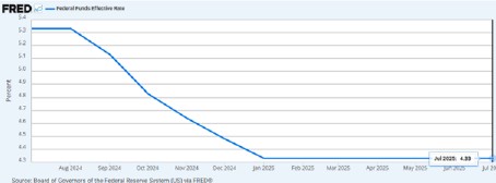 As of mid August 2025, the Federal Reserve’s effective federal funds rate sits at 4.33 percent, down noticeably