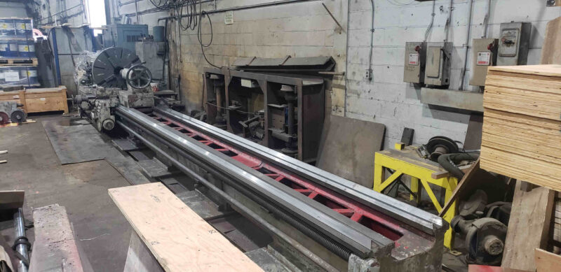 Description: Edelstaal 52" x 200" Heavy Duty Engine Lathe, Model 1000 x 5000, With Raised Head Stock, 36" Swing Over Cross Slide, 61.5" Swing in Gap, 4-1/8" H.I.S., 8 1250 RPM, IN/MET Threading, Hardened & Ground Bed Ways, 30 Hp, D-1-11" Camlock Spindle Nose, 19.5" 3-Jaw Chuck, 4-Way Tool Post, 4-Way Rapid Traverse, Taper Attachment, Tail Stock, New 1978.