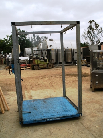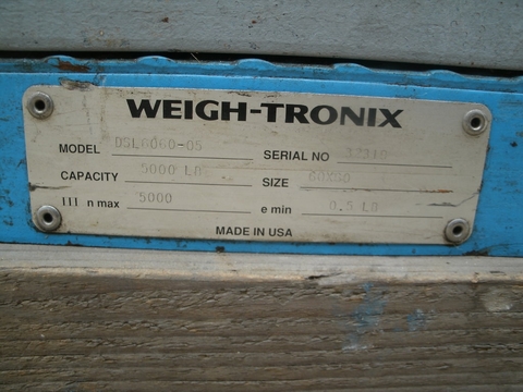 Weigh Tronix model DSL-6060-05 carbon steel platform / supersack back scale. Unit has square frame with hooks for bag weighing and 60" x 60" platform for pallets, etc. Unit has capacity of 5,000 pounds with minimum of 0.5 pounds. Unit has digital indicator, serial number 32319.