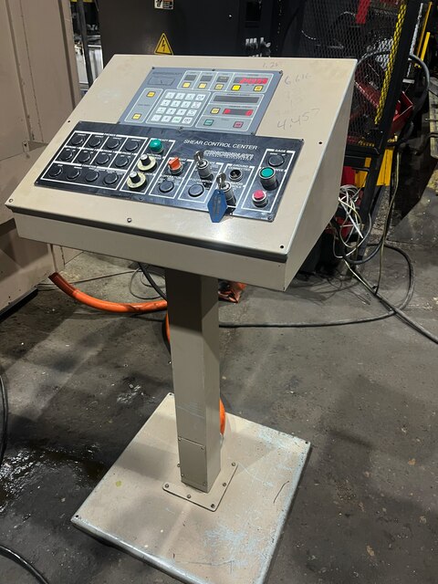 ¼” X 10’ Heavy Duty Production Shear with Programmable Control (Programs: Cut Length, Rake Angle, Blade Gap and 0-48” Back Gage Position), (2) 120” Cincinnati Front Gauge Arm, Dual Hold Downs on Each End, (3) Additional 2’ Front Support Arms, Hydraulic Back Gauge Pull Back ...more