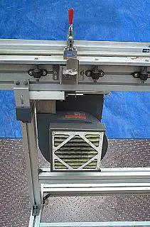 Hoppmann Air Conveyor. S/N: 389710. Maximum aperture/clearance: 1-3/4 in. W x 1-1/2 in. H (usable). Travel length: 118 in. L. Adjustable guiderails. Conveyor infeed height: 41-1/2 in. H. (adjustable). Conveyor discharge height: 45 in. H (adjustable). Dayton Motor, 1/3 hp, 3450 rpm, 115/230 V, 5.4/2.7 amps, 60 Hz, single phase. Dayton Blower Model: 2C820. Overall dimensions: 118 in. L x 24 in. W x 53 in. H.