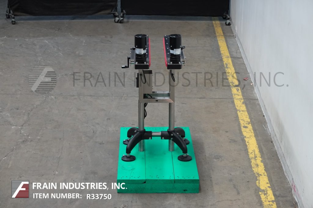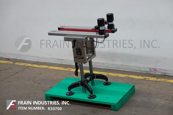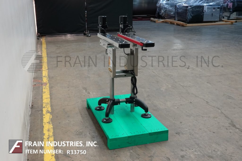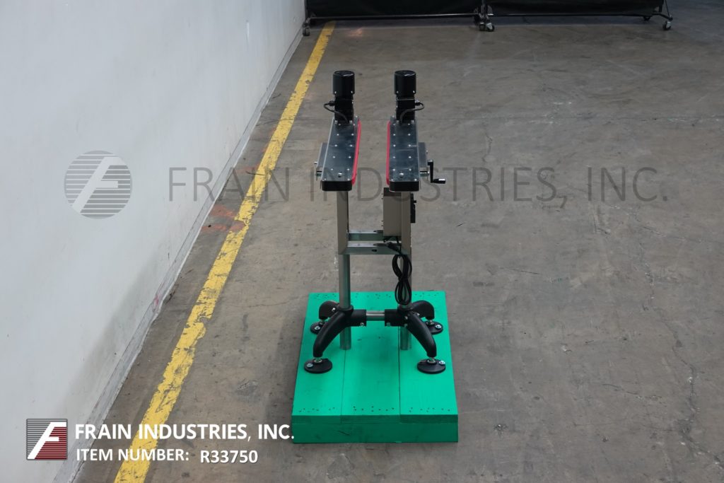 Globaltek Stainless steel, Bottomless, side belt transport conveyor with number of product per minute – depending on material and application. Equipped with single 32" long x 1" wide rubber side product gripper belts with independant drives each side, variable speed control and hand crank adjustabe to handle containers from ¼" to 7½" in diameter. Mounted height adjustable base. Ideal for transfering product from one machine to another with out intergraded conveyor system and also for bottom date coding,
