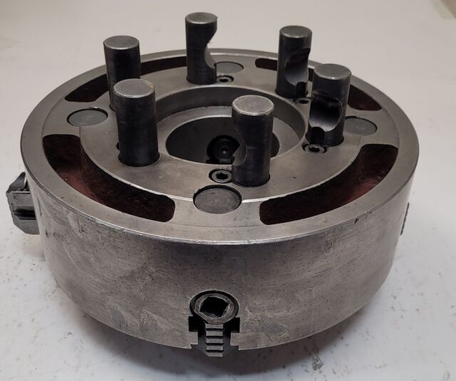 This listing is for a USED HOWA H037M10 10 3Jaw Power Chuck (flatback, opencenter)., - 254mm (10) diameter with ~75mm throughhole, - Hardened reversible jaws for internal/external gripping, - Max speed approx. 4,200rpm, jaw stroke ~9.3mm, - Heavy-duty wedgehook design, ideal for CNC/production lathes, - Backmount type ...more
