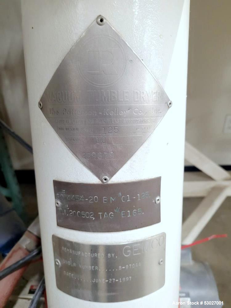 used- patterson-kelley double cone vacuum dryer, 10 cubic feet working capacity, stainless steel construction, maximum material density 125 pounds a cubic foot. top port, bottom outlet with valve. shell driven by an approximate 1/2hp gear motor. mounted on stands. sold as is, no jacket ratings.