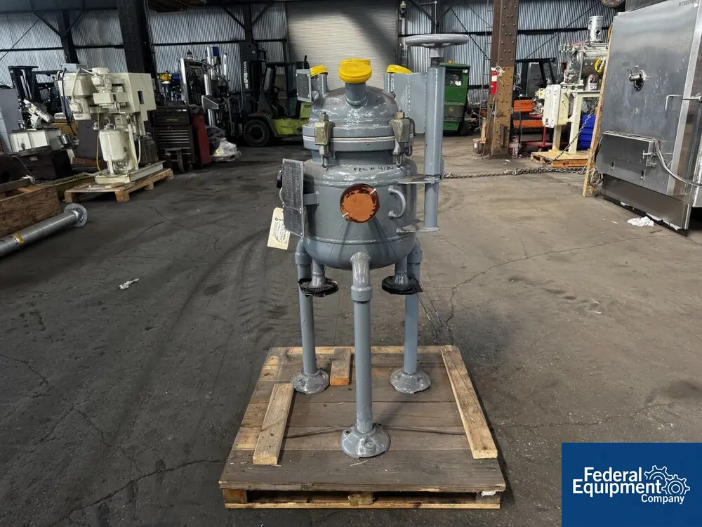 Pfaudler glass-lined 30 gallon pressure tank rated at 30 PSI at 300 degrees Fahrenheit internal. Tank measures 20" diameter x 22" straight side with dish bottom, (2) 2" and 1-1/2" top inlet and 2" center bottom discharge. Unit has plunger valve. Has (1) 4" patch., Materials of Construction: Glass-Lined, Internal ...more