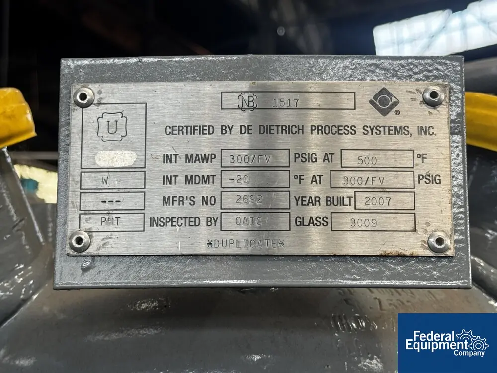 Used 10 gallon Dedietrich glass lined reactor, model CTJ-10, rated 300 psi and full vacuum at 500 f internal, jacketed for 115 psi at 500 f, serial# 2692, national board# 1517, built 2007.