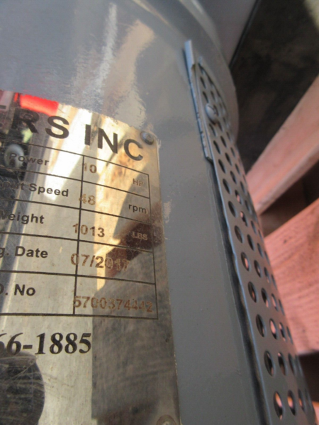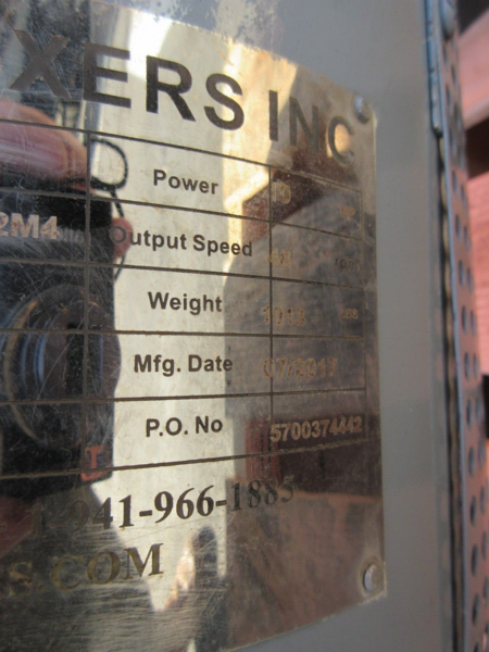 Boston Agitator Drive. S/N: F584. Motor : 10 hp, 1,725 rpm, 122 rpm (final), 208-230-460 V, 60 Hz, 3 phase. Mounting base dimensions: 16 in L x 16 in W with (4) 3/4 in. dia. attachment holes at a center-to-center distance of 13-1/2 in. Overall dimensions: 16 in. L x 16 in. W x 32 in. H.