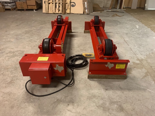 New Webb 10-Ton Turning Rolls, Make: Webb, Model: T30-PWR-16 / T30-IDL-16, 20,000lb Capacity (1 Driver & 1 Idler ), 12'' - 16ft Diameter Range, 0 - 45 IPM Variable Speed Range, 4 Rubber Tires ( 14'' Wide Contact Surface) ( 12'' Diameter ), 120 Volt Input, Hand Pendant Controller, 1 Year ...more