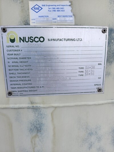 This 1997 pop tank features a capacity of 100 bbls and is designed for sour service. It is coated with Devoe 253 but requires inspection. The tank is elevated and operationally connected, with a design pressure of 8 psi. Located in Strathmore, AB, it has a double-wall construction and does not include secondary containment or insulation.
