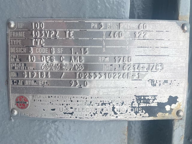 100 HP 3560 RPM U.S. Motors, Frame 405VPZ, TEFC, 114 Amp, 1.15 service factor, 460 Volts