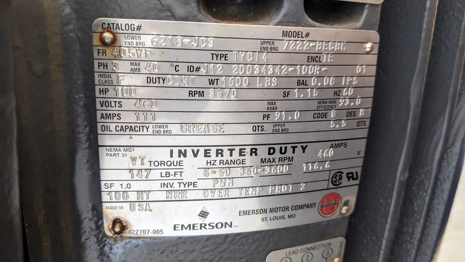 For sale is one (1) new unused from old stock US Motors / Emerson Vertical Electric Motor. Inverter Duty. 405VP Frame, 3 Phase, TE Enclosure. 100 HP, 460 Volts, 3570 RPM, 1.15 SF, 60 Hz. Shaft 1 5/8" diameter x 4 1/2" long.