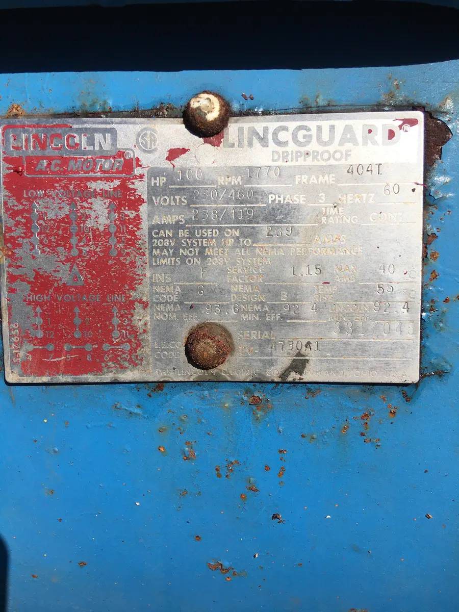 Vilter 448 8-Cylinder Reciprocating Compressor. Serial No: 15760 A BRC, Order No: C 99147-6, Model: 448, Previous Refrigerant: Ammonia. Number of Cylinders: 8. Maximum RPM: 1200, Bore & Stroke(in): 114x89, Displacement M3hr: 232. Lincoln Motor - HP: 100, RPM: 1770, FR: 404T, Volts: 230/460, PH: 3, HZ: 60, Time Rating: Cont, Ins: F, Service Factor: 1.15, Max AMB: 40c, Time Rise: 55 c, Nema Nom EFF: 93.6, Nom Min Eff: 92.4, Min Eff: 92.4, Serial No: 3317045.
