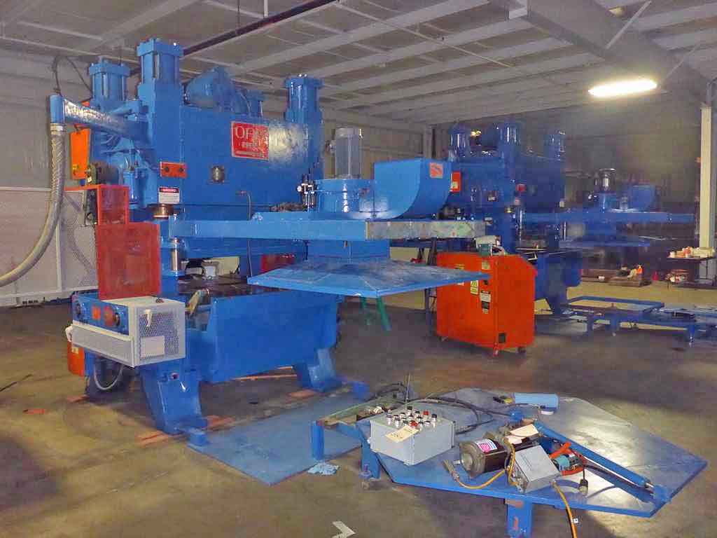 Oak FP3-54-1422 Fin Press Line, Tonnage: 100, Die Area: 51" l-r x 48" f-b, Stroke: 1.50", Shut height: 9" - 12", Bolster: 5", Withdrawal Travel: 9" - 14", Speed: 133 - 300 spm, Electrics: 460 volt, 3 ph, 60 cycle, Oak uncoiler, Fin stock lube tank, Fin vacuum suction unit, Oak fin Stacker, Height of the press: 135" ...more