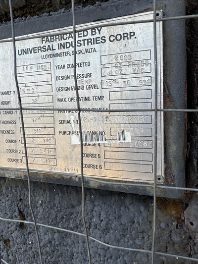 Available for sale: A 1000 BBL storage tank manufactured by Universal, built in 2005. This heated and insulated tank features a double-wall design for enhanced safety and durability. Currently, the unit is disconnected and located in the County of Vermilion River, AB, Canada. Ideal for various storage applications.