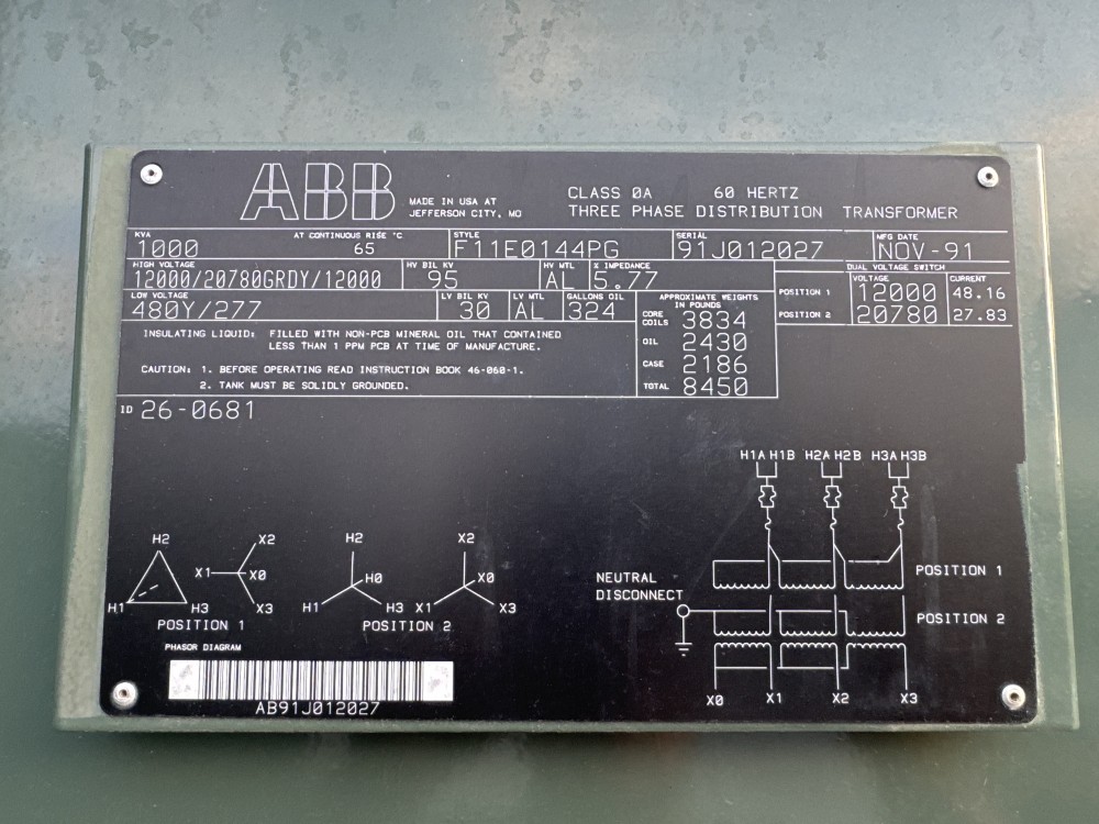1000 KVA 12000 Primary, 480Y/277 Secondary, ABB, oil, outdoor, #LT4375