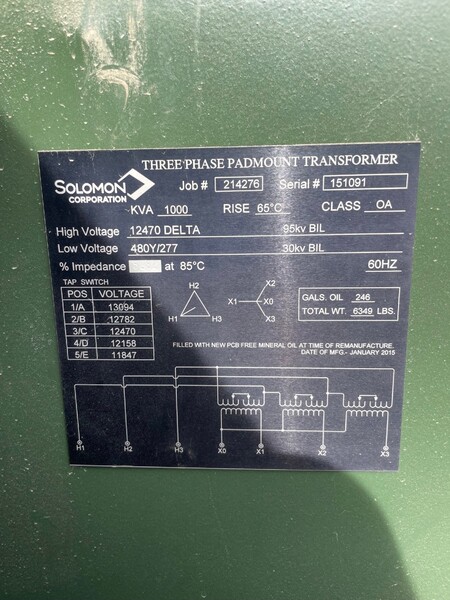 3-Phase Padmount Tranformer, Solomon Corp., 1000 KVA, Class OA, Temp Rating 65 C, HV 12470 Delta, 60 Hz. We have three (3) of these available.
