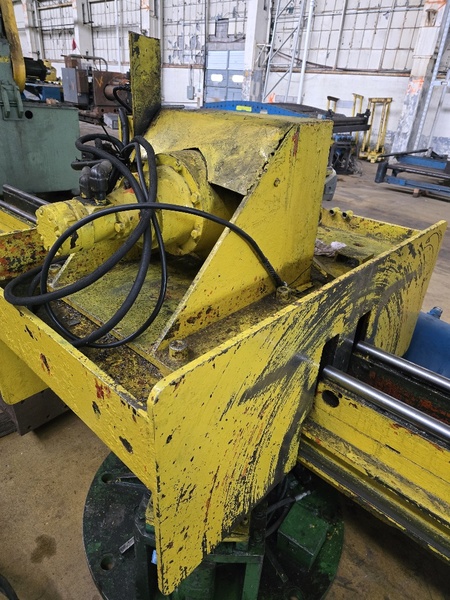 -10,000# Capacity, -Right Angle Discharge, -Has Pick and Place capability, -Hydraulically Powered Conveyor Rols, -3.5" Dia. x 76" Face Rolls on 6.5" Centers, -1.375" Round Shafts, -81" Table Length, -36.75" Conveyor Pass Height when lowered, -61.75" from floor to top of horn when raised, -5" Wide x 8" High x 19" Long ...more