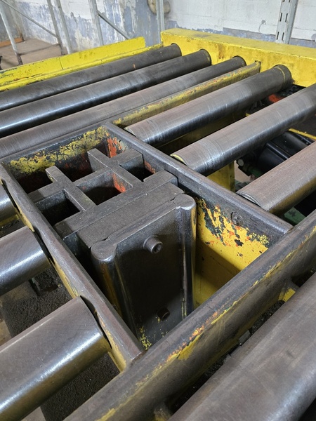 , 10,000# capacity, Has Pick and Place capability, Hydraulically powered conveyor rolls, 3.5" dia. x 76" face rolls on 6.5" centers, 1 3/8" Round shafts, 81" table length, 36.75" conveyor pass height when lowered, 61.75" from floor to top of horn when raised, 5" wide x 8" ...more
