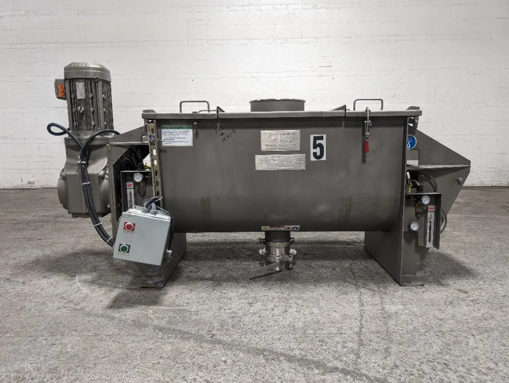 New 10 Cubic Foot Ribbon Blender, 304 Stainless Steel construction, polished to RA25 grade finish. Driven by 5 HP motor, 3-phase, 60 Hz, 230/460 Volt, UL listed drive and controller with emergency stop. Trough measures approximately 1092 mm x 560 mm x 660 mm. s stainless steel lid and safety grate, center bottom ...more