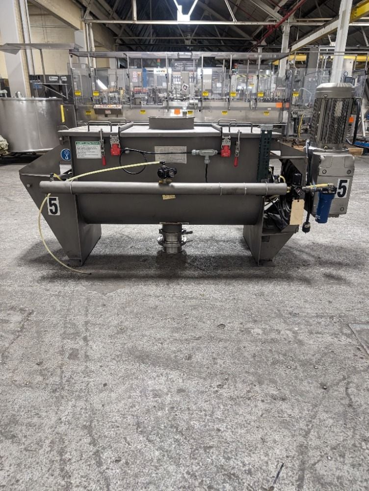 , 10 Cu.Ft. Sanitary Stainless steel Ribbon Blender built by Aaron Process. Unit driven by a 5 HP, 220-230/440-460 volt, 1715 rpm motor. Split hinged lid. Video of unit running available. Last used in sanitary food facility., AARON PROCESS 10 Cu.Ft. Sanitary Stainless steel Ribbon Blender, Blender/ Mixer Type. RIBBON ...more