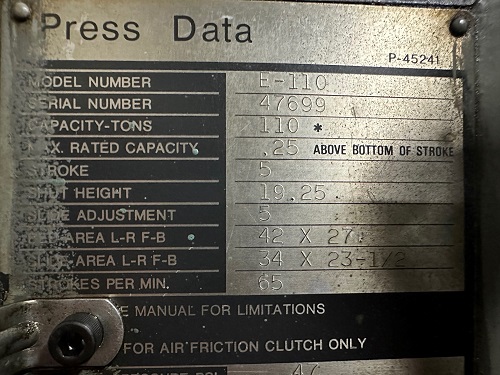 110 TON NIAGARA MODEL#E-110 MECHANICAL GAP FRAME PUNCH PRESS, 5" STROKE: STOCK 17122 SERIAL. 50628 MODEL. E-110 CAPACITY. 110 TON STROKE. 5" SHUT HEIGHT. 19.25" ADJUSTMENT. 5" MOTORIZED BED AREA. 42" X 27" BOLSTER. 4" THICK SLIDE AREA. 28" X 21" SPEED. 40 SPM CLUTCH & BRAKE. AIR CUSHION. YES PALM BUTTOMS AND FOOT ...more