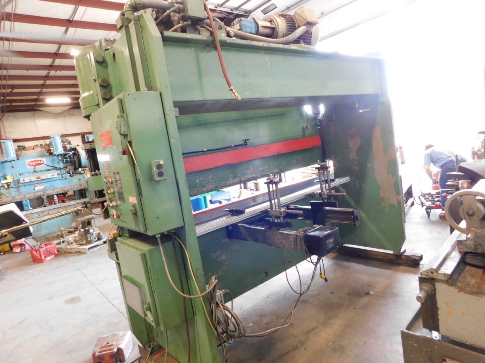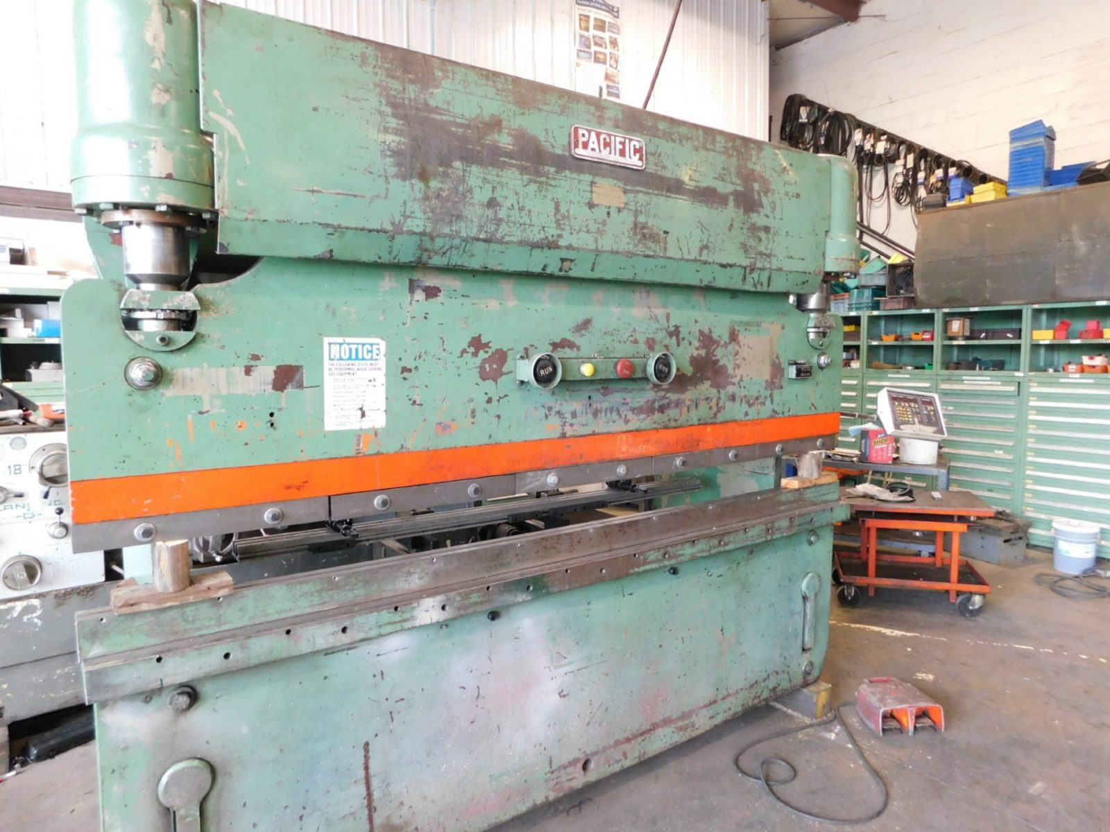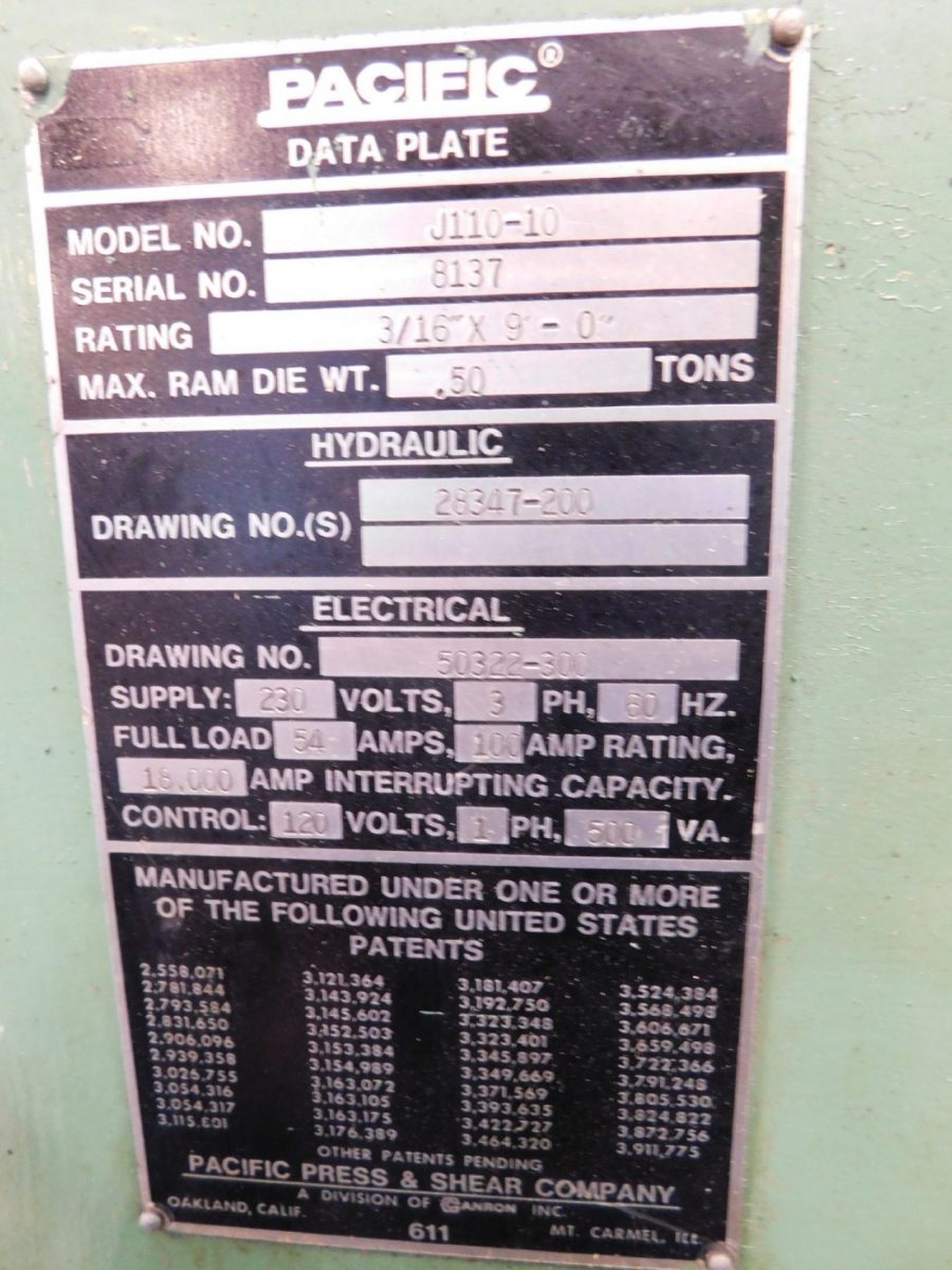 PACIFIC 100 TON X 10' HYD PRESS BRAKE, STOCK# 14416J, SERIAL No. 5742, MODEL. J110-10, OVERALL LENGTH OF BED. 120", CAPACITY. 110 TONS, MAXIMUM BENDING LENGTH.120", DISTANCE BETWEEN HSGS. 8' 6", GAP DEPTH. 6", TABLE HEIGHT. 35", OPEN HEIGHT. 13", MAXIMUM RAM STROKE. 8", CLOSED HEIGHT. 5", BACKGAUGE MAX DEPTH. ...more