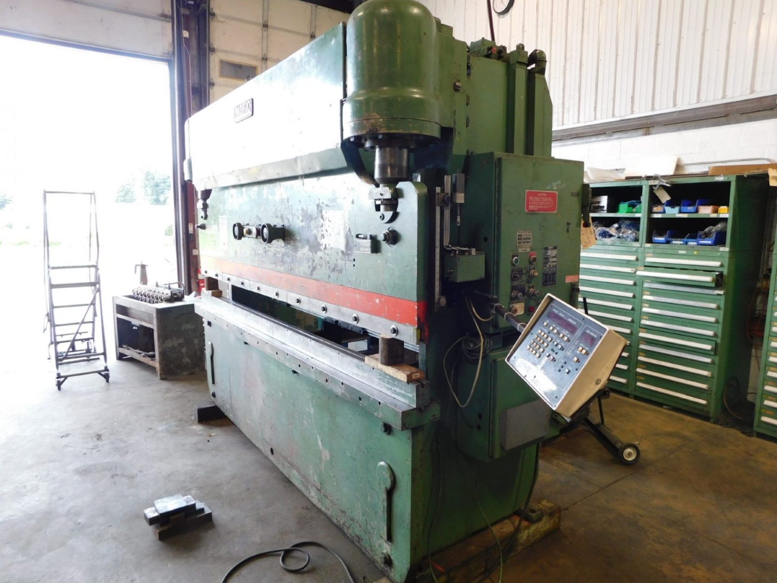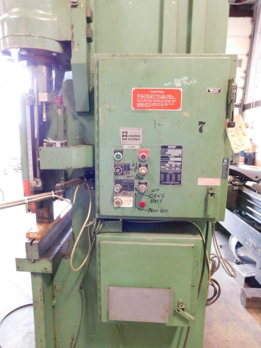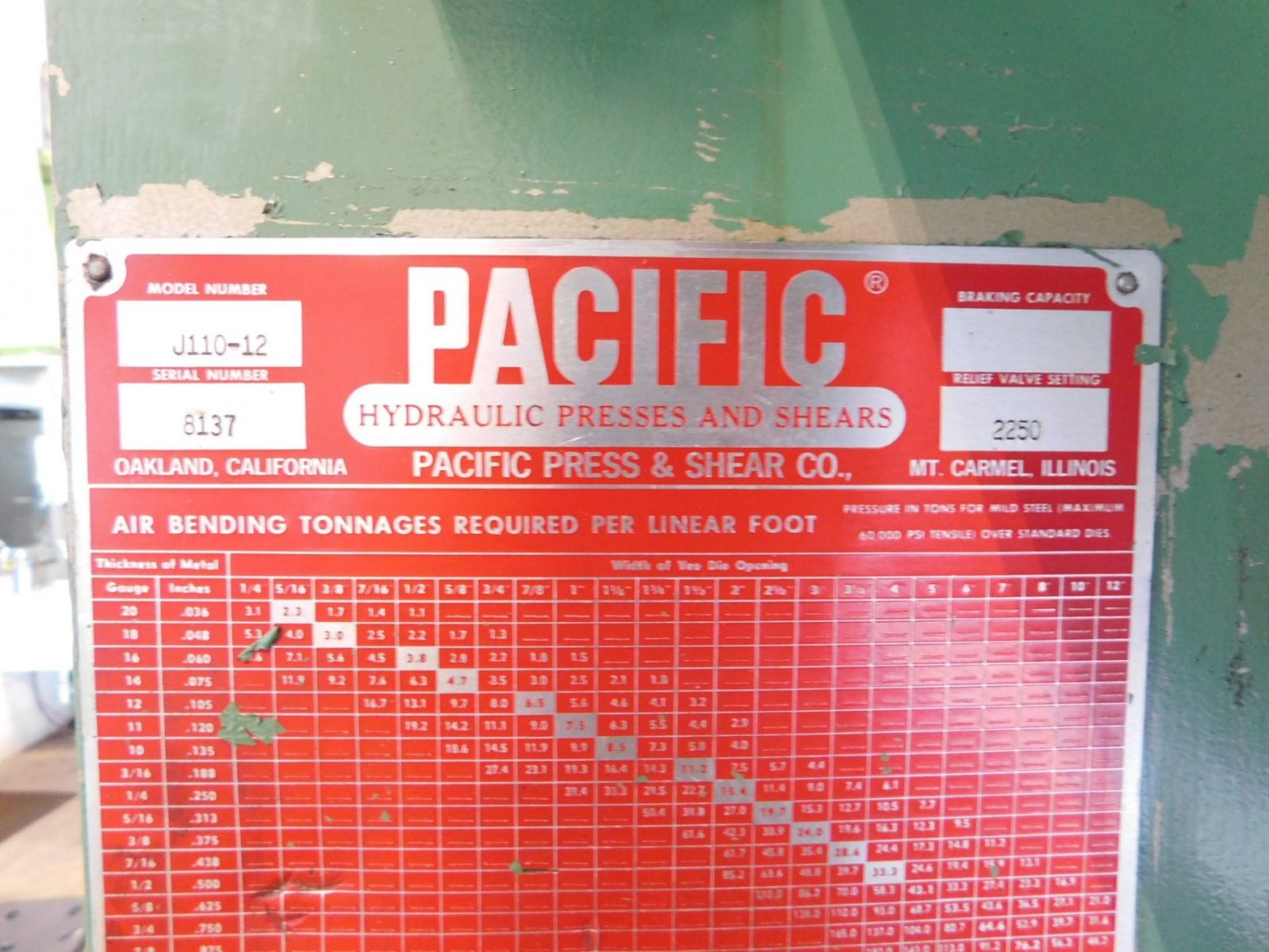 ORDER 110, SERIAL No. 5742 MODEL. J110-10 OVERALL LENGTH OF BED. 120" CAPACITY. 110 TONS MAXIMUM BENDING LENGTH.120" DISTANCE BETWEEN HSGS. 8' 6" GAP DEPTH. 6" TABLE HEIGHT. 35" OPEN HEIGHT. 13" MAXIMUM RAM STROKE. 8" CLOSED HEIGHT. 5" BACKGAUGE MAX DEPTH. 28" RAM DEPTH ADJUSTMENT. YES RAM RETURN. MANUAL & AUTO ...more