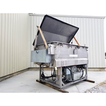 Stainless Steel dual shaft paddle mixer, driven by 30 HP motor, 75 cubic feet approximate capacity, trough measures 71 x 48, 38 deep, paddles measure 15 x 8 x 12 and are thick, twin shafts each measures 4 diameter. Side bottom outlet measures 17 x 15. Previously used in food processing facility., HP: 30, Cubic Feet: ...more