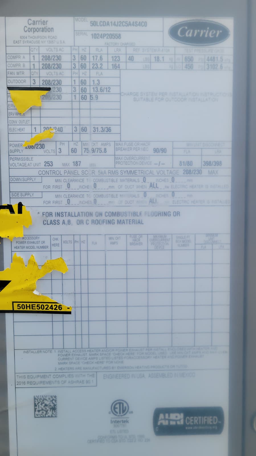 New Carrier 2024 12.5 Ton Ultra High Efficiency 208/230 3 Phase R410A Electric Heat (Low) Model # 50LCDA14J2C5A4S4C0 Serial # 1024P20558