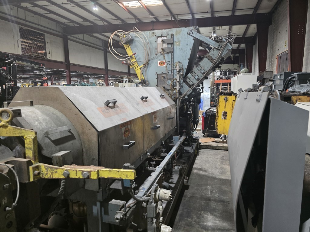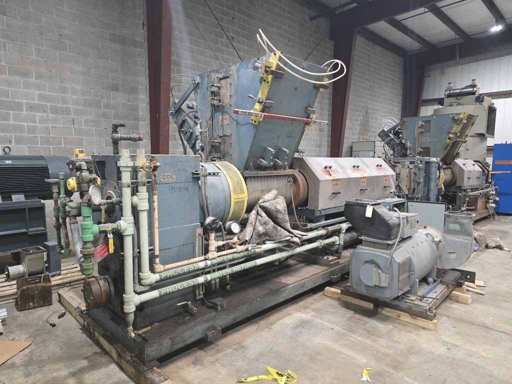 Item 6205 - One (1) Used Farrel 15" Dump Extruder, drop extruder, hot feed extruder, feed opening 36" wide x 24.5" deep, stuffer 35" wide x 8" thick with 13" stroke, 95:1 total gearbox reduction (19.4:1 primary gearbox X 4.93 secondary gearbox), GE 200hp 1150/1800 RPM 500 VDC motor, enlarged feed section, pneumatic ...more