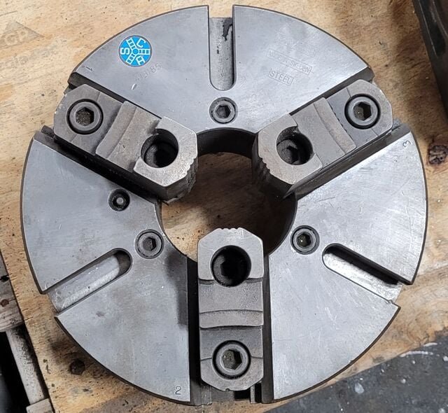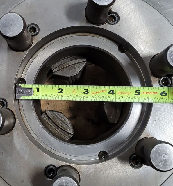 DIAMETER OF CHUCK. 12", NUMBER OF JAWS. 4, CHUCK WIDTH. 3 3/4", HOLE IN CENTER. 3", BACKING. D1-6, JAWDIMENSTION. 4" X 1-1/2".
