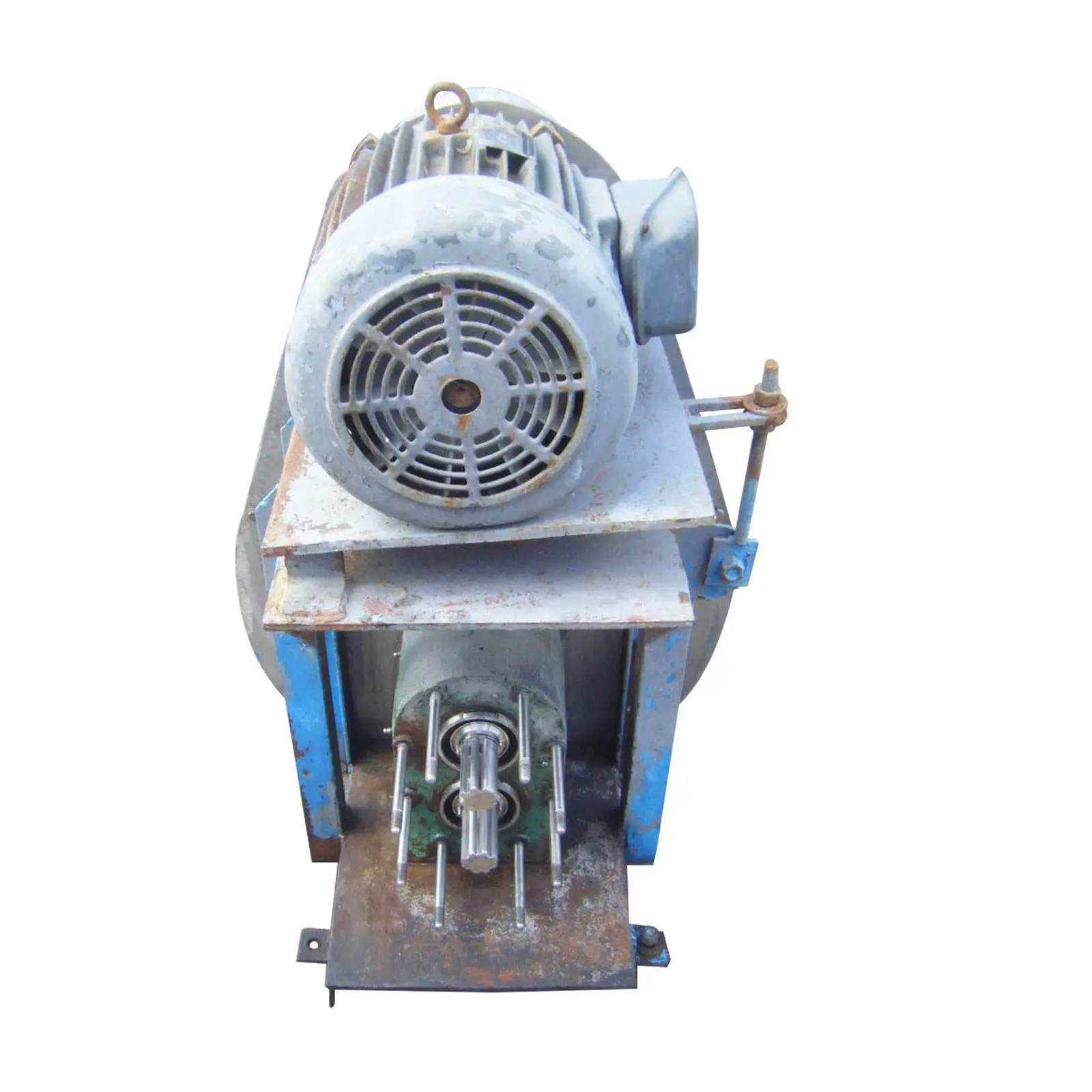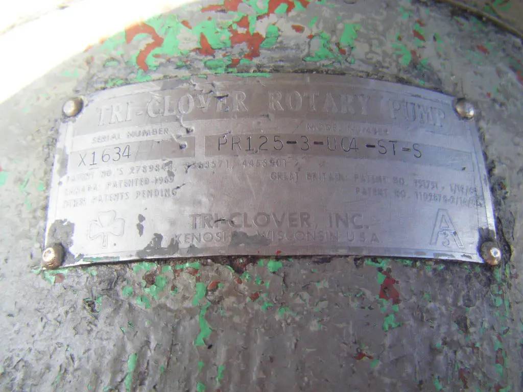 Tri-Clover Positive Displacement Pump. Model: PR125-3-UC4-ST-S. Flow rate for new pump is 120 gpm with required horsepower and pressure. Discuss with salesperson your process and product to determine if this pump should handle your specific duty. No rotors. Pulleys dia: 5 in. driver, 1 ft. 2 in. driven. Teco Electric and Machine Company, LTD. motor: 5 Hp, 1150 Rpm, 230/460 V, 14/7 A, 60 Hz, 3 Phase. Overall dimensions: 2 ft. 2 in. L x 1 ft. 11 in. W x 3 ft. 5-3/4 in. H.(ACN148).