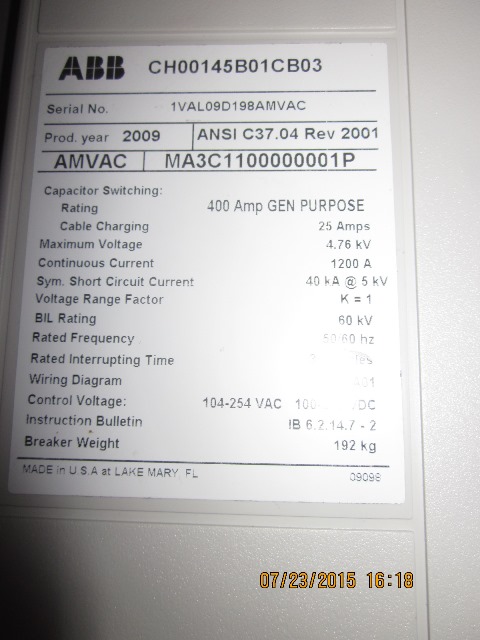 CB-18026:, ONE (1) UNUSED 1200 AMP ABB AMVAC VACUUM CIRCUIT BREAKER, TYPE MA3C1100000001P, ABB CH00145A01CB03, ANSI C37.04 REV 2001, CAPACITOR SWITCHING -, 400 AMP GEN. PURPOSE RATING, 25 AMPS CABLE CHARGING, 4.76 KV MAXIMUM VOLTAGE, 1200 AMP CONTINUOUS CURRENT, 40 KA SHORT CIRCUIT @ 5 KV, 1.0 K FACTOR, 60 KV BIL ...more