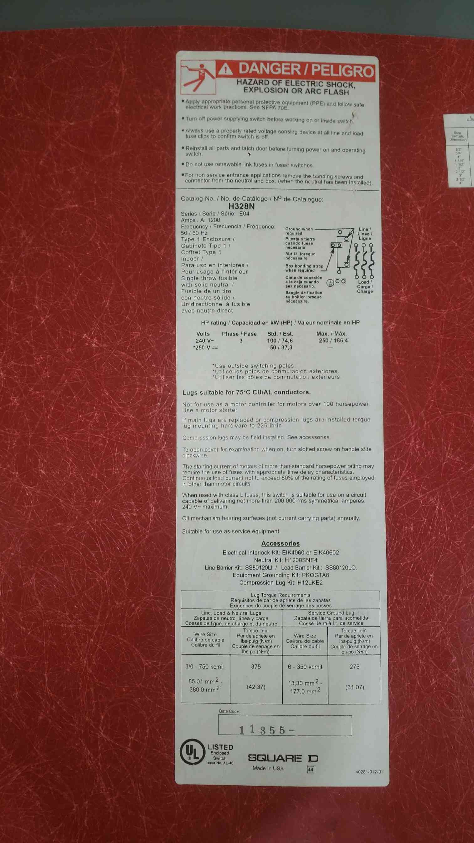 1200 Amps, Square D H368, 600VAC/VDC, Heavy Duty Safety Switch w/ Fuses, unused, AS IS