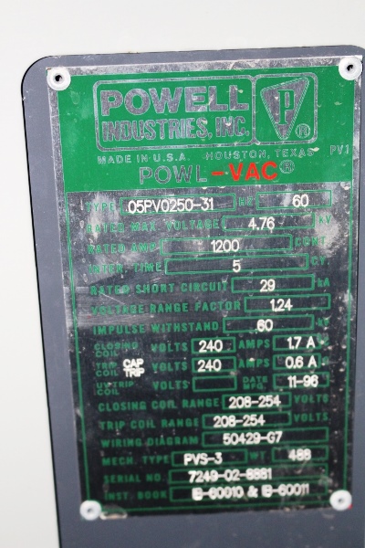 Powell 1200 Amp POWL-VAC 05PV0250-31 Electric Operation Drawout 4760 Volt