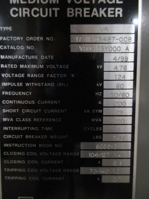 1200 Amps, Square D, VR, V5D4133Y000A, 4.76 KV, 50/60 hz., (3 available)