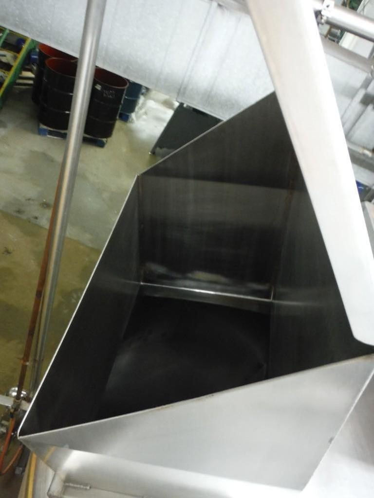Feldmeier, 1,200 gallon capacity, 304 stainless steel mixing tank. Vessel dimensions: 72" diameter x 64" straight wall with dish style bottom. Equipped with a 20" diameter lift up and clamp down man way and 24" x 16" open man way. 7½ Hp bridge mounted sweep agitator. Unit mounted on (4) tube legs with a 3¾" OD / 3" ID Tri-clamp style bottom discharge with 16" ground clearance.