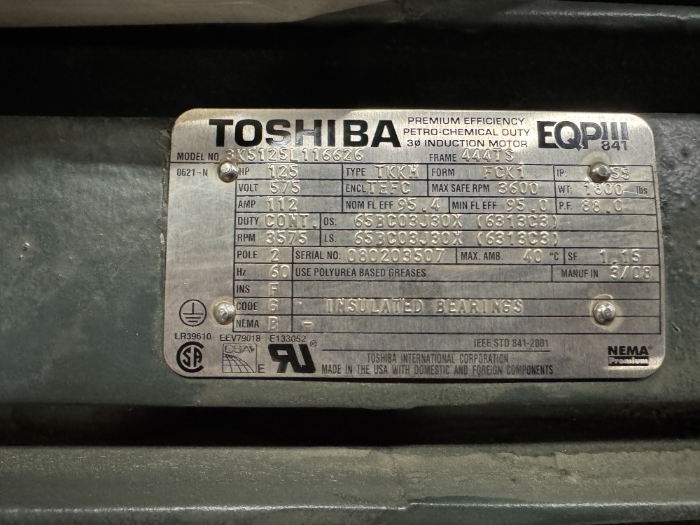 TECO-WESTINGHOUSE 125 HP AC MOTOR, 575V 3PH 60HZ, 3560RPM, FRAME 444TS, Manufacturer TECO-WESTINGHOUSE Model 125HP Condition Used Stock Number 904723.154MA.
