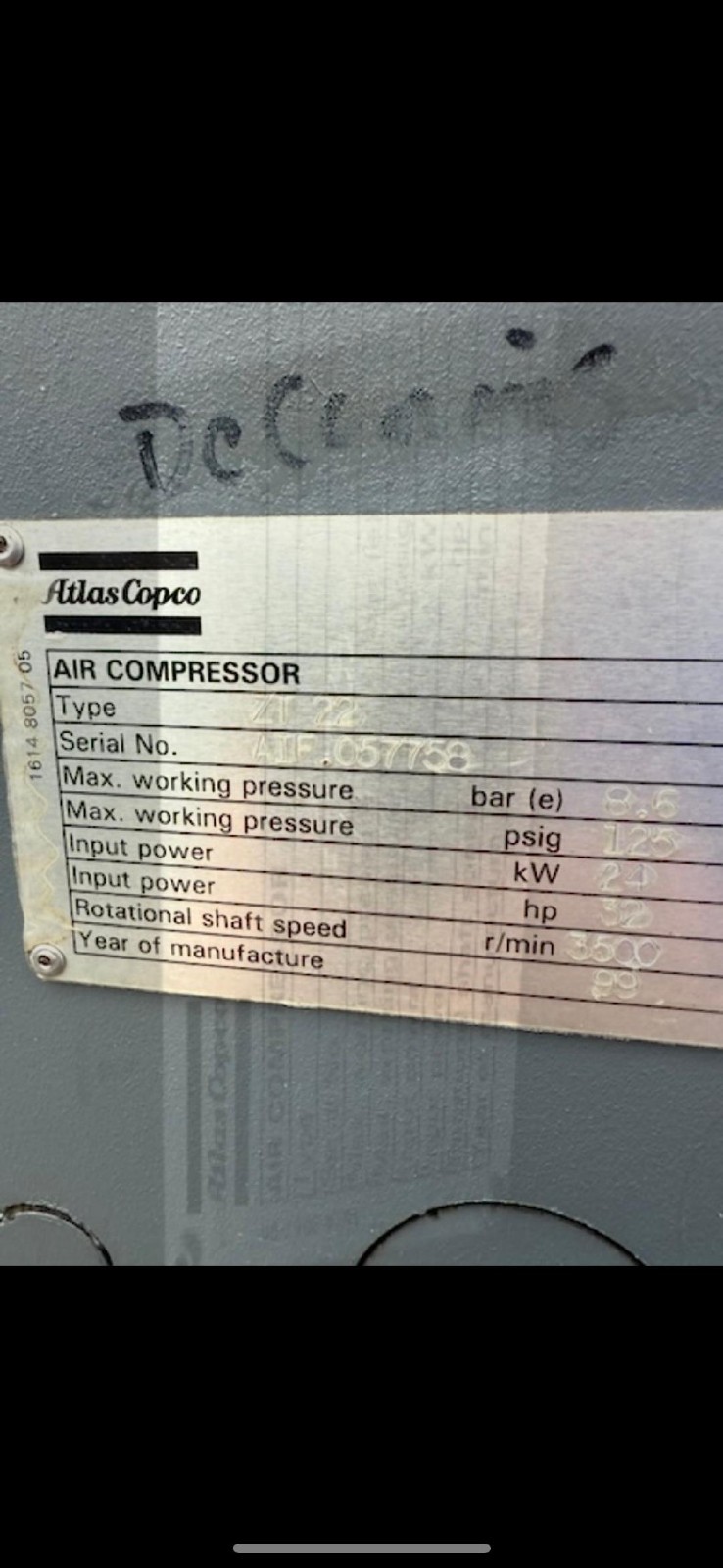 125 psig, Atlas Copco #ZT-22, Rotary Air Compressor, 32 HP, 3500 RPM, 1999