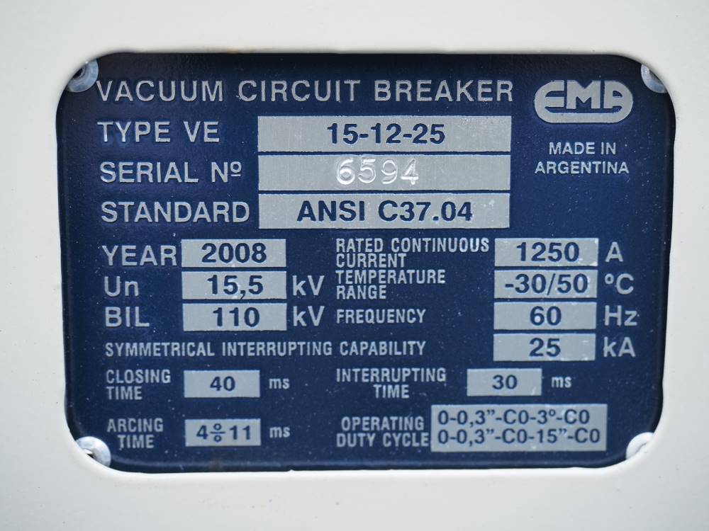 1250 Amp, EMA, No. VDH-15kV, 15500 Volts, Vacuum, 25kA Short; Unused