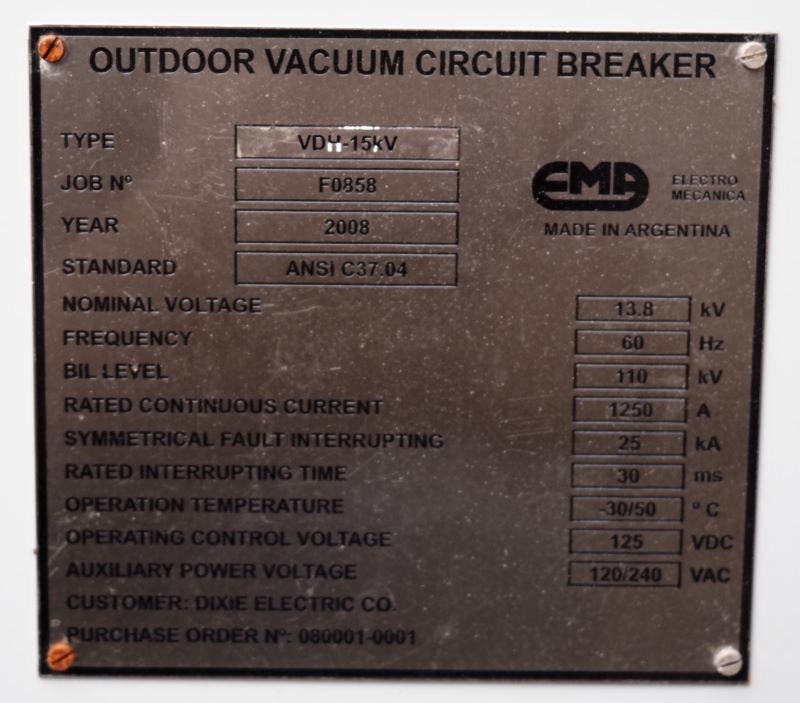 CB-19865, One (1) 1250 Amp Unused EMA Vacuum Circuit Breaker, 15.5kV Max, VDH-15kV, 60hz, 25kA Short Sym, 110kV BIL, Operating Voltage- 125 VDC, Aux Power 120/240VAC, ANSI C37.04, 6x 1200:5 MRCTs c400, Polymer Bushings.