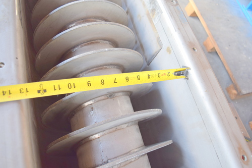 Stainless steel screw auger feeder conveyor, 12”stainless screw auger (trough width 13”), 6ft stainless screw conveyor length, conveyor inside length 6ft+-I.D.- overall O.D. length 10ft, stainless steel screw feeder, flighting spacing 3”+- & ¼” thick, U-trough housing conveyor, the gearbox has been removed, 11”+- diameter bottom discharge- knife valve is available, contact us for a delivered price or additional photos,
