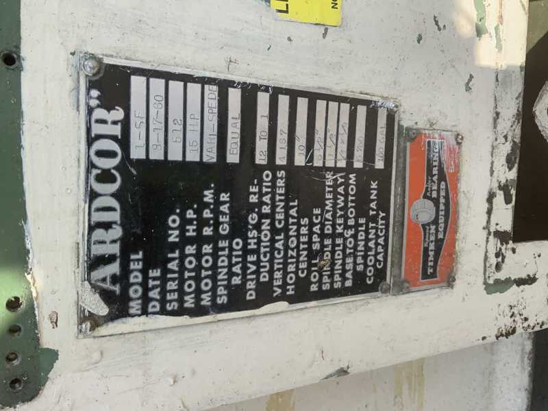 SERIAL. 520, MODEL. S-F, VERTICAL CENTER. 4.187", VERTICAL ADJ. 3", HORIZONTAL CENTER. 5.5", ROLL SPACE. 10", SPINDLE DIAMETER. 1-1/2", SPINDLE KEYWAY.250" X.125", BASE TO BOTTOM SPINDLE. 5-3/4", GERING. EQUAL, BASE. 14 STAND BASE, FLOW. RIGHT TO LEFT, MOTOR. VARI SPEED 15 HORSEPOWER.
