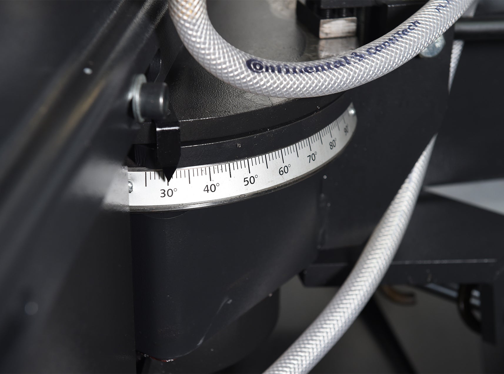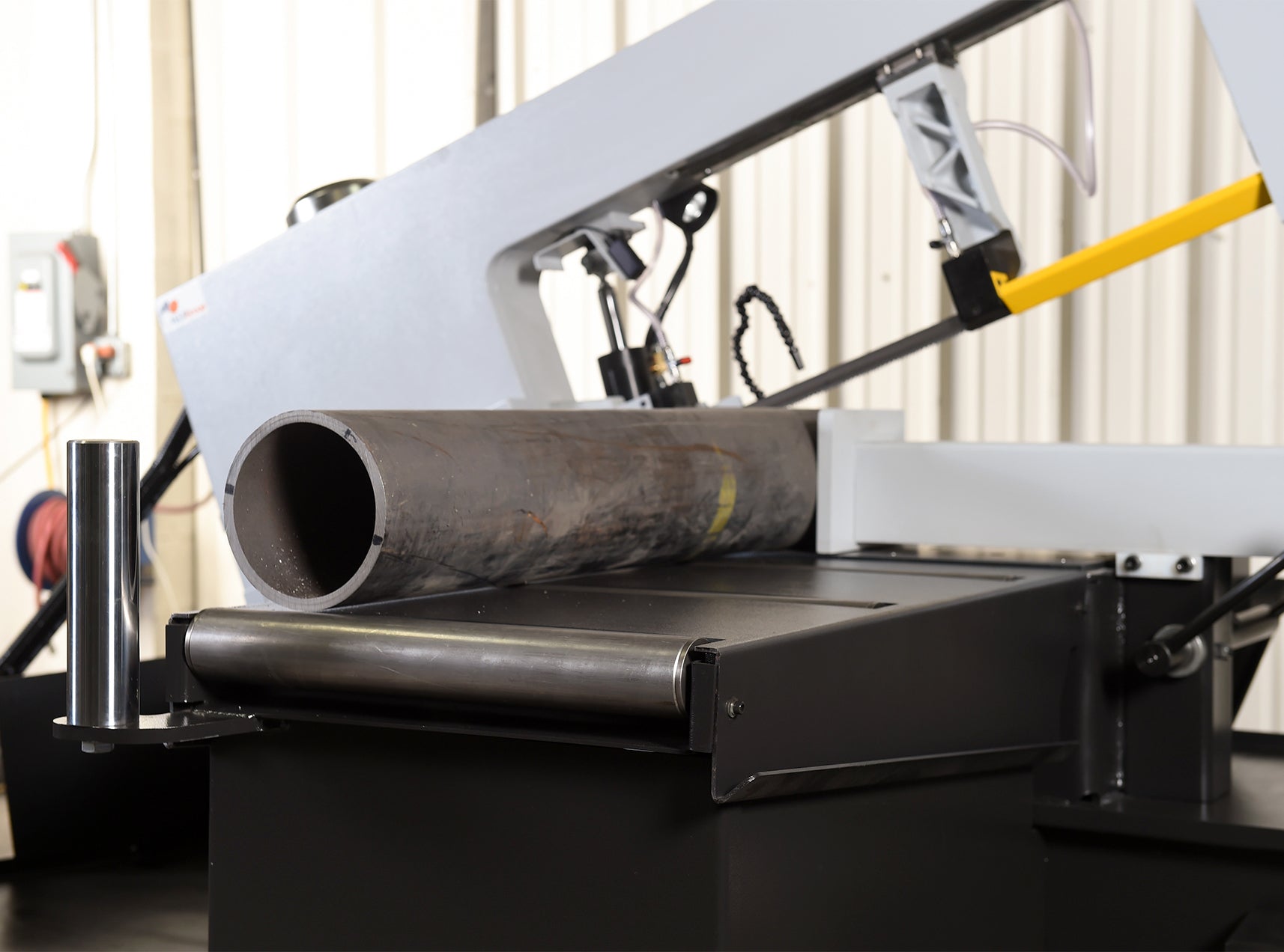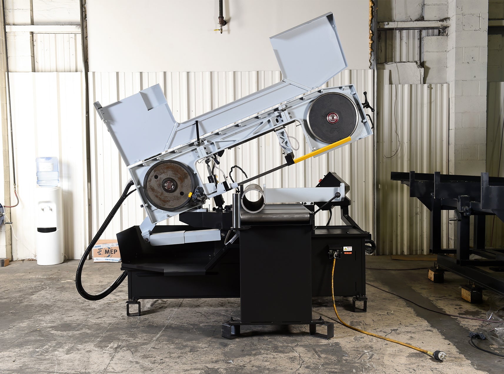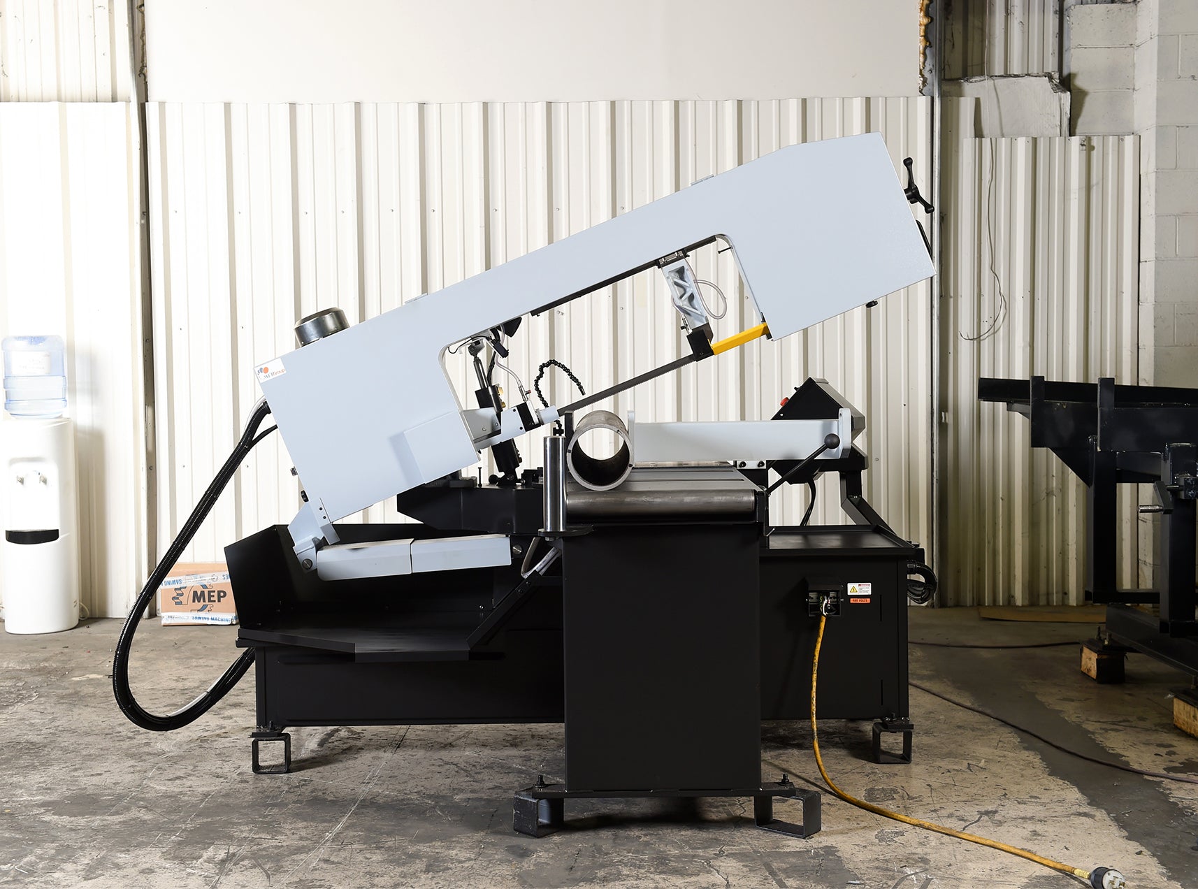 , Easy swing, heavy duty, cast iron saw head that can swing up to 60° in one direction, 3 HP true direct blade drive-no belts/pulleys, 36” material in-feed roller table and 19” out feed table, Heavy duty, quick adjusting, sliding material vise jaw, Mechanical band tensioning w/digital readout, Cast ...more