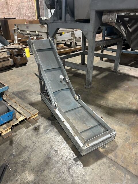 Carbon steel conveyor, belt, 13" x 6', carbon steel, stainless steel, 1-1/2" hp. Belt conveyor, 13" wide x 6' long, mounted on carbon steel frame with stainless steel sidewalls. Driven by 1-1/2 HP, 230/460V, 3/60Hz cycle motor. Also includes 9" diameter X 14" face rotor with (10) paddles on rotor, mounted on ...more