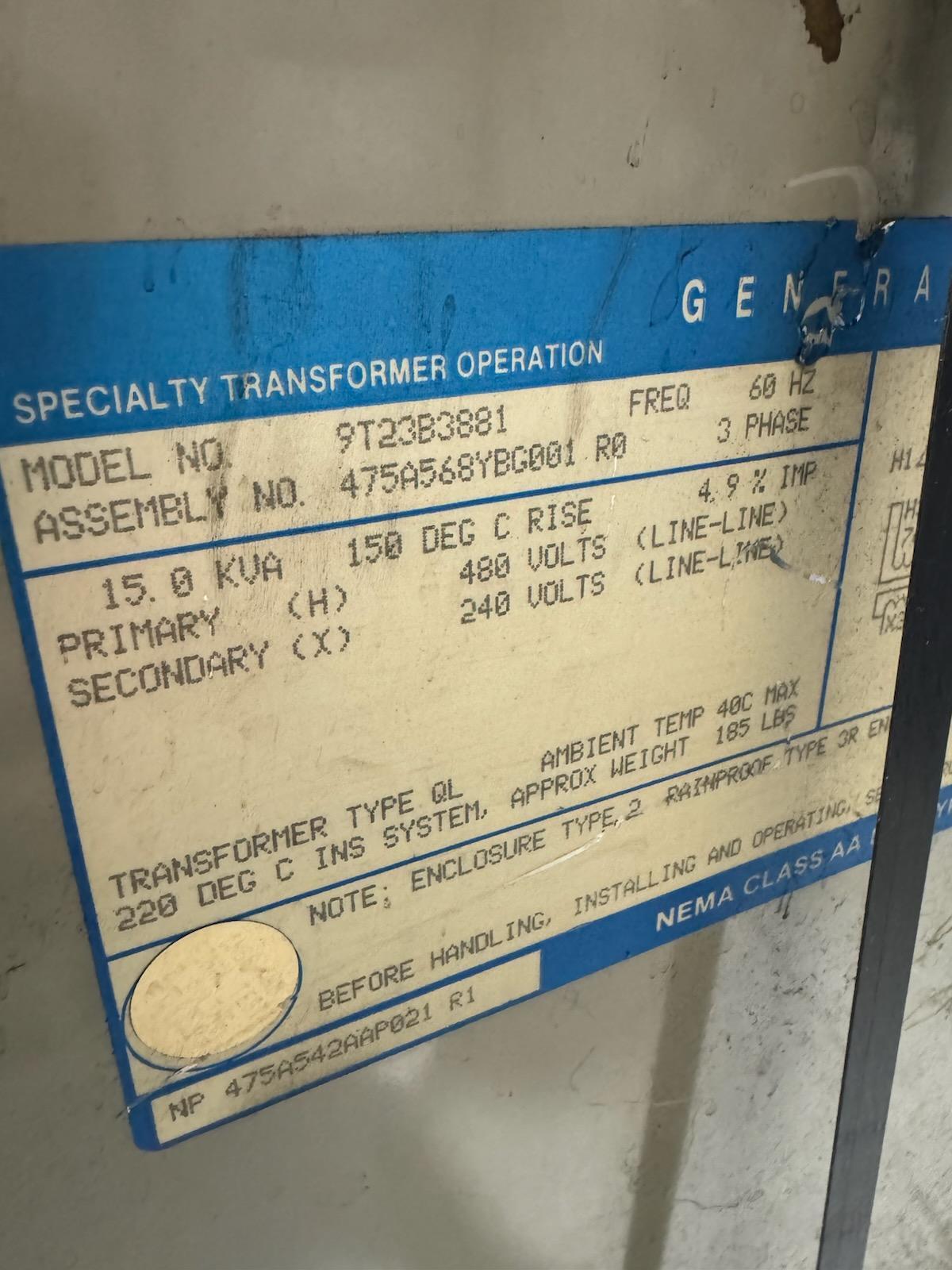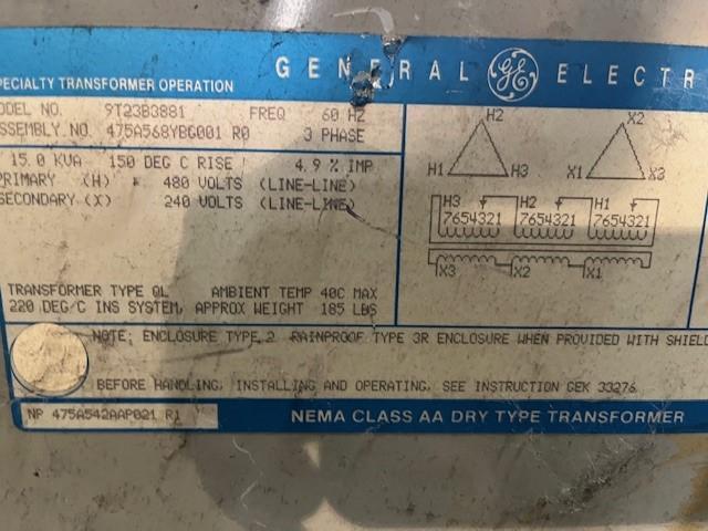 15 KVA 480 Primary, 240 Secondary, General Electric #9T23B3881, Dry Type
