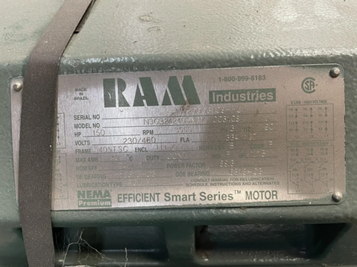 Ram Industries High Efficiency Motor. Serial No: 7012635-01. Hp: 150, Frame: 405TS, ENCL: ODP. RPM: 3560, Volts: 230/460, Ph: 3, Hz: 60, Amps: 343/114.