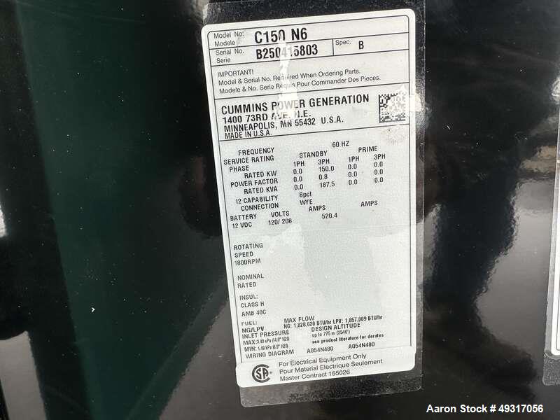 150 KW Cummins #C150N6, Natural gas / propane generator set, 120/208 Volts, 240 HP @ 1800 RPM, QSJ8.9G engine, 2500 hours, EPA Certified, sound attenuated enclosure, 2023