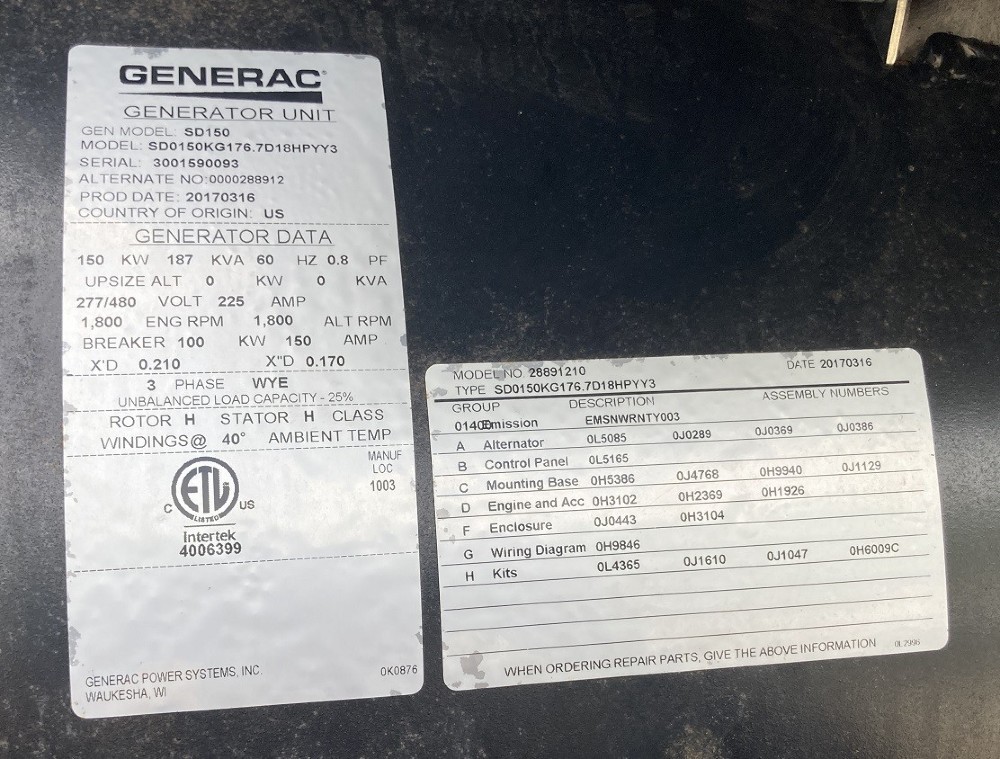 Generac 150 kW standby (135 kW prime) diesel generator set, model SD01500, SN-8484128. Iveco/FPT model F4HE9685A 6.7L, engine rated 240 HP at 1800 RPM, SN-J102-01098173, EPA Tier 3 emissions. 3/60/120/208V, 12 lead reconnectable to other voltages. (2) 200 Amp main-line circuit breakers. PMG - permanent magnet ...more
